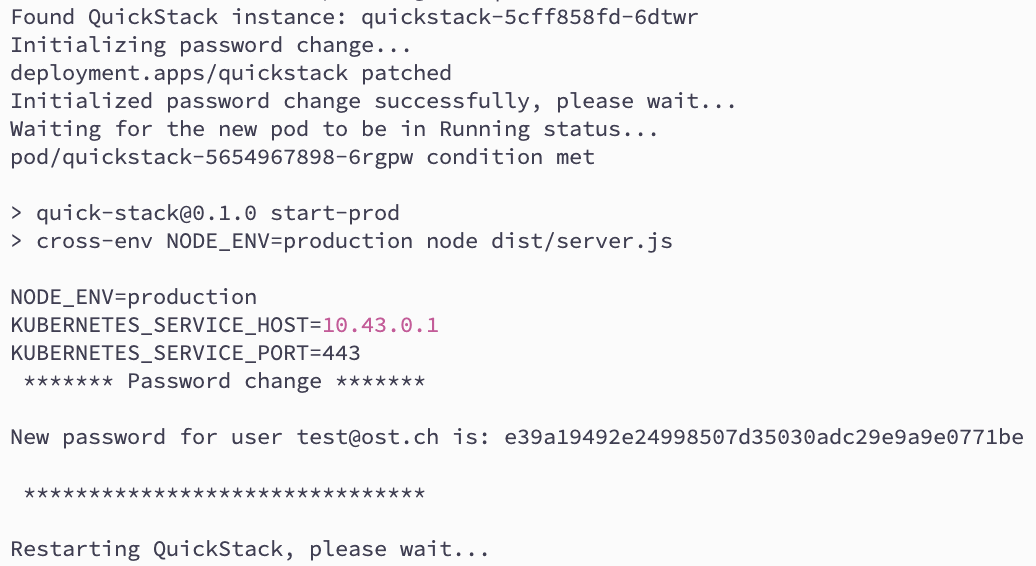 curl -sfL https://get.quickstack.dev/reset-password.sh | sh -warning Cluster installations If QuickStack runs on a multi-node cluster, run this command on the master node.