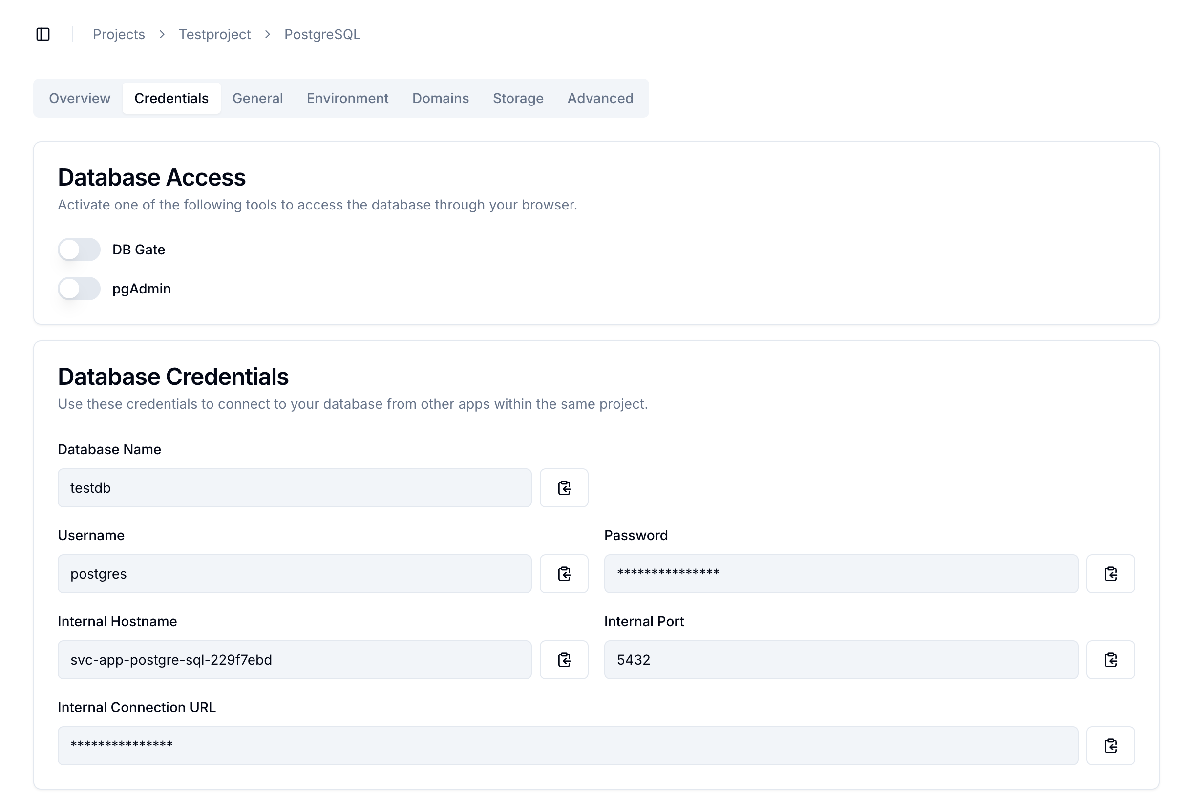 svc-<app-id>(find the exact value in the app's Credentials tab) - Port: standard port for the engine (PostgreSQL: