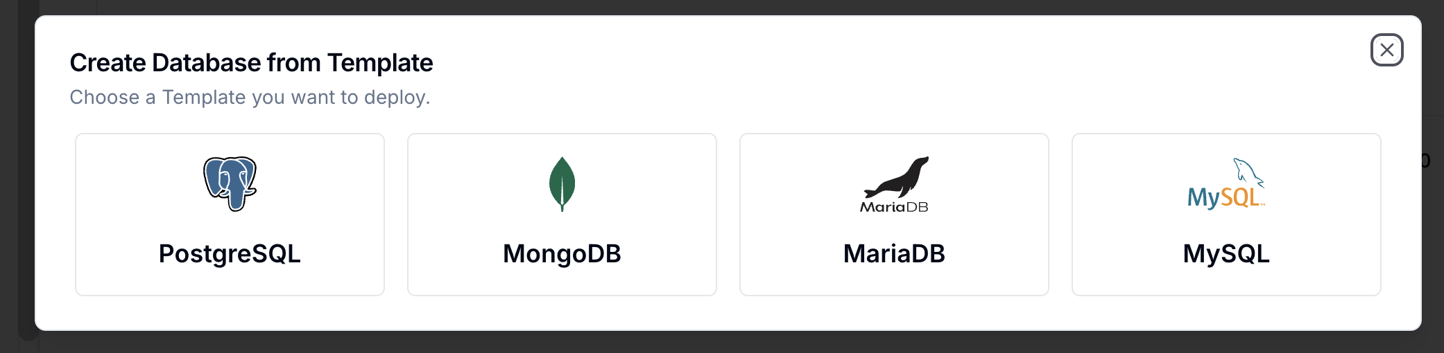 Deploy pre-configured databases (PostgreSQL, MySQL, MariaDB, MongoDB) from QuickStack templates.