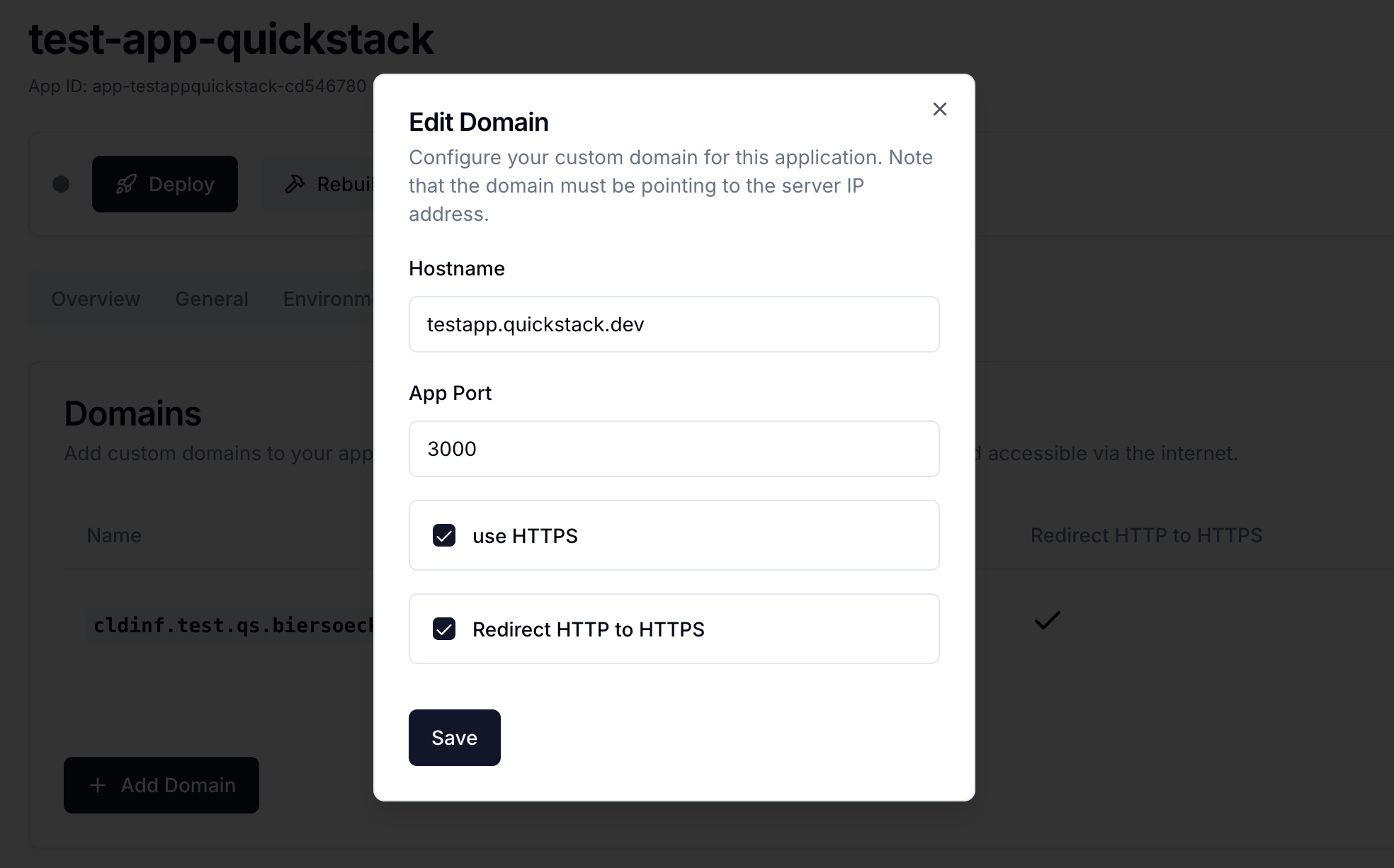 Add a custom domain and enable HTTPS for your QuickStack application.